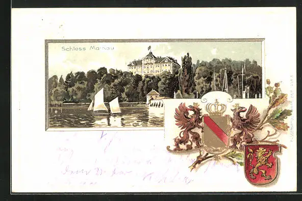 Passepartout-Lithographie Mainau, Schloss mit Uferpartie, Wappen
