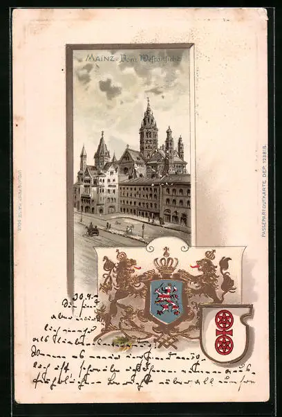 Passepartout-Lithographie Mainz, Domansicht von Westen, Wappen
