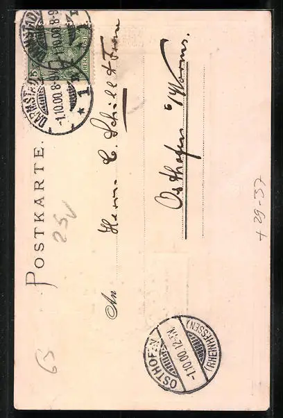 Personenbezogene Daten auf der Rückseite der Karte wurden durch blauen Textmarker unkenntlich gemacht. Die blauen Stellen sind auf die Vorderseite durchgeweicht und wirken sich negativ auf das Postkartenfoto aus