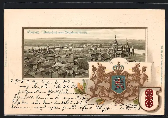 Passepartout-Lithographie Mainz, Teilansicht vom Stephansturm, Stadt-Wappen