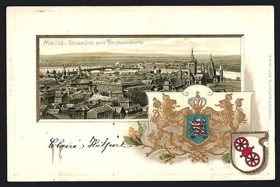 Passepartout-Lithographie Mainz, Totalansicht der Stadt vom Stephansturm aus, Wappen