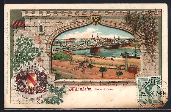 Passepartout-Lithographie Mannheim, Neckarbrücke, Burgmauer mit Wappen
