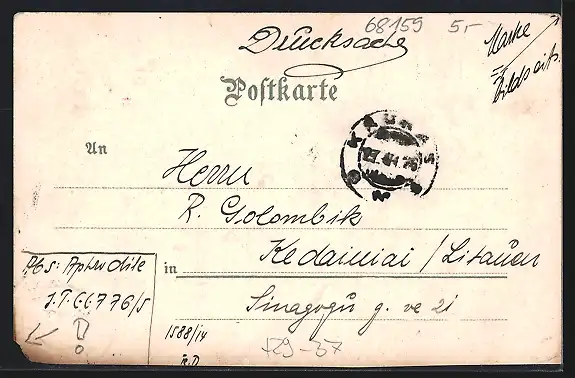 Personenbezogene Daten auf der Rückseite der Karte wurden durch blauen Textmarker unkenntlich gemacht. Die blauen Stellen sind auf die Vorderseite durchgeweicht und wirken sich negativ auf das Postkartenfoto aus