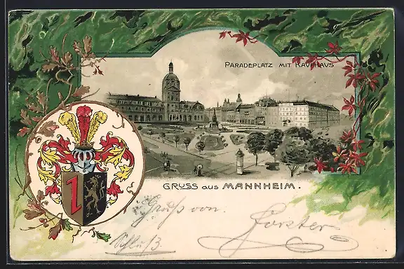Passepartout-Lithographie Mannheim, Paradeplatz mit Kaufhaus, Wappen
