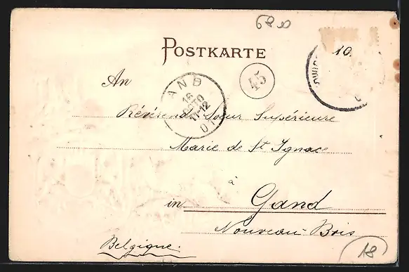 Personenbezogene Daten auf der Rückseite der Karte wurden durch blauen Textmarker unkenntlich gemacht. Die blauen Stellen sind auf die Vorderseite durchgeweicht und wirken sich negativ auf das Postkartenfoto aus