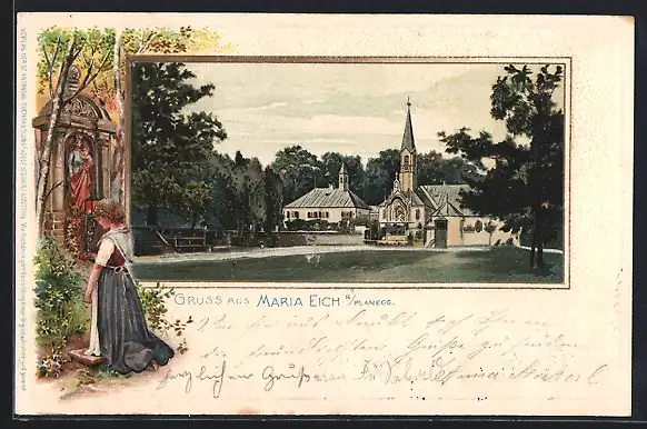 Passepartout-Lithographie Maria Eich a. Planegg, Blick zur Kirche, Waldandacht