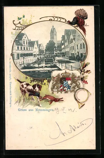 Passepartout-Lithographie Memmingen, Ortsansicht mit Kirche, Wappen