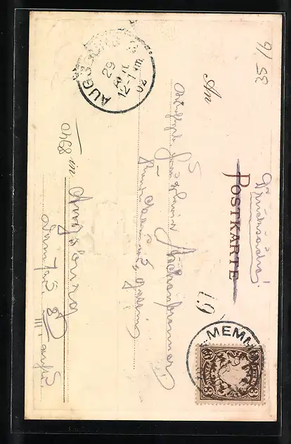 Personenbezogene Daten auf der Rückseite der Karte wurden durch blauen Textmarker unkenntlich gemacht. Die blauen Stellen sind auf die Vorderseite durchgeweicht und wirken sich negativ auf das Postkartenfoto aus