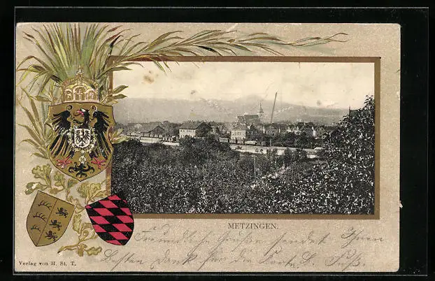 Passepartout-Lithographie Metzingen, Totalansicht, Wappen