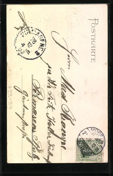 Personenbezogene Daten auf der Rückseite der Karte wurden durch blauen Textmarker unkenntlich gemacht. Die blauen Stellen sind auf die Vorderseite durchgeweicht und wirken sich negativ auf das Postkartenfoto aus