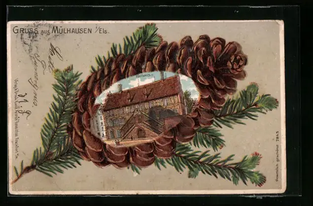 Passepartout-Lithographie Mülhausen i. Els., Rathaus im Tannenzapfen