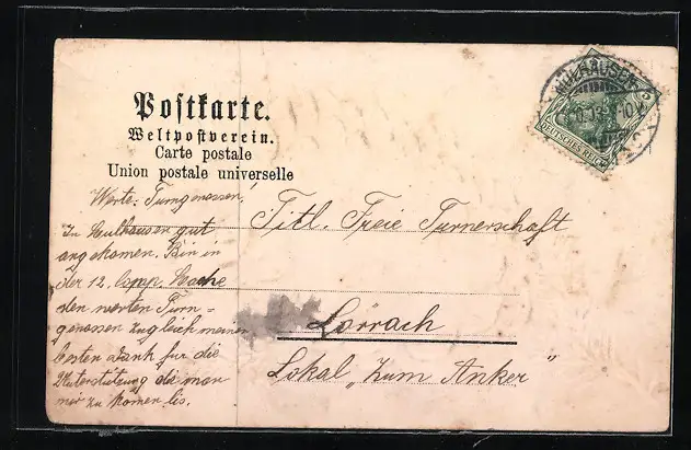 Personenbezogene Daten auf der Rückseite der Karte wurden durch blauen Textmarker unkenntlich gemacht. Die blauen Stellen sind auf die Vorderseite durchgeweicht und wirken sich negativ auf das Postkartenfoto aus