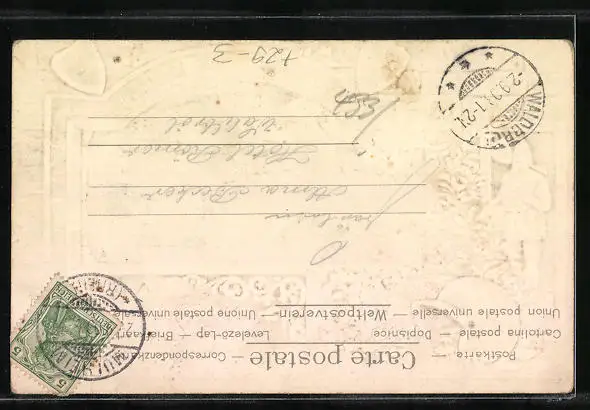 Personenbezogene Daten auf der Rückseite der Karte wurden durch blauen Textmarker unkenntlich gemacht. Die blauen Stellen sind auf die Vorderseite durchgeweicht und wirken sich negativ auf das Postkartenfoto aus