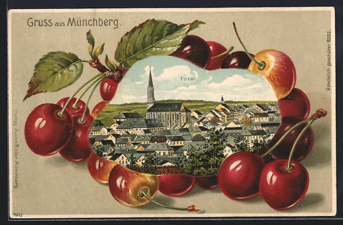 Passepartout-Lithographie Münchberg, Totale mit Kirche zwischen Kirschen
