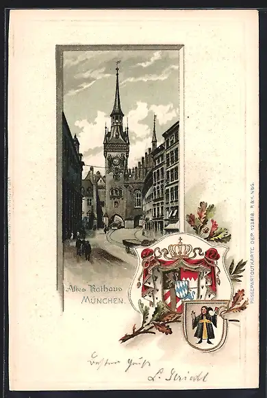 Passepartout-Lithographie München-Au, Altes Rathaus, Wappen, Strassenbahn