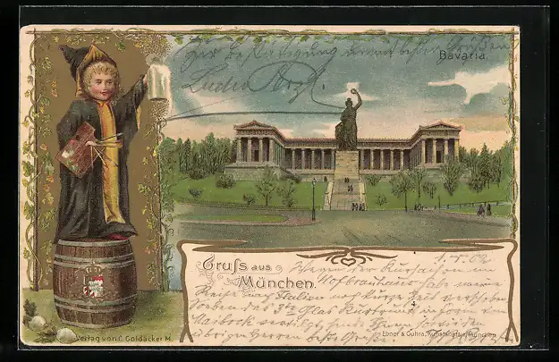Passepartout-Lithographie München, Bavaria mit Tempel, Münchner Kindl mit Palette