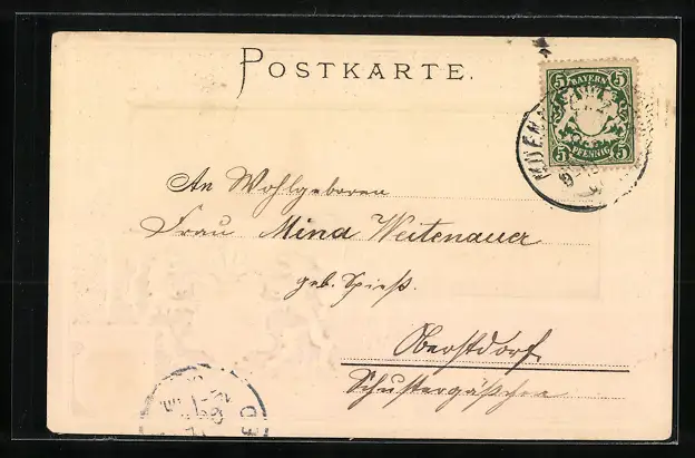 Personenbezogene Daten auf der Rückseite der Karte wurden durch blauen Textmarker unkenntlich gemacht. Die blauen Stellen sind auf die Vorderseite durchgeweicht und wirken sich negativ auf das Postkartenfoto aus