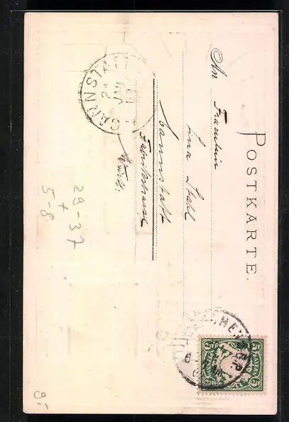 Personenbezogene Daten auf der Rückseite der Karte wurden durch blauen Textmarker unkenntlich gemacht. Die blauen Stellen sind auf die Vorderseite durchgeweicht und wirken sich negativ auf das Postkartenfoto aus