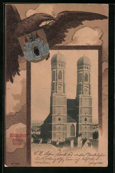 Passepartout-Lithographie München, Frauenkirche mit Wappen