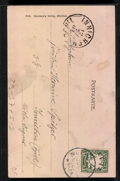 Personenbezogene Daten auf der Rückseite der Karte wurden durch blauen Textmarker unkenntlich gemacht. Die blauen Stellen sind auf die Vorderseite durchgeweicht und wirken sich negativ auf das Postkartenfoto aus