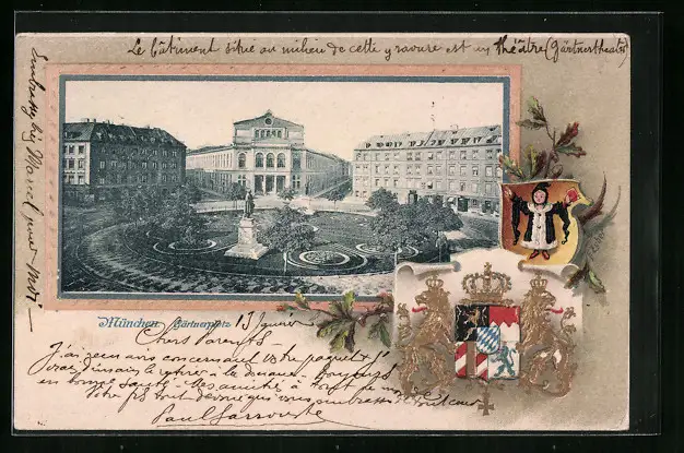 Passepartout-Lithographie München, Grünanlagen am Gärtnerplatz, Wappen mit Münchner Kindl