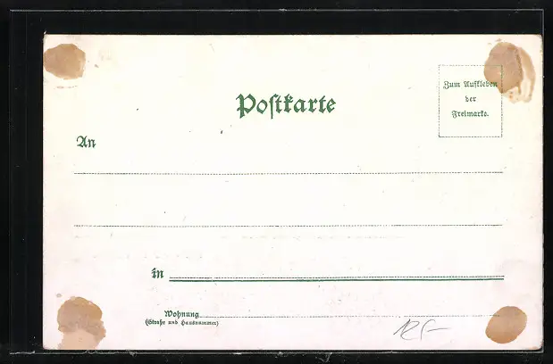 Personenbezogene Daten auf der Rückseite der Karte wurden durch blauen Textmarker unkenntlich gemacht. Die blauen Stellen sind auf die Vorderseite durchgeweicht und wirken sich negativ auf das Postkartenfoto aus