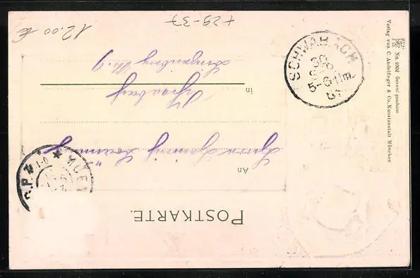 Personenbezogene Daten auf der Rückseite der Karte wurden durch blauen Textmarker unkenntlich gemacht. Die blauen Stellen sind auf die Vorderseite durchgeweicht und wirken sich negativ auf das Postkartenfoto aus