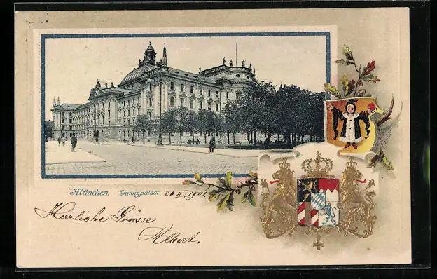 Passepartout-Lithographie München, Justizpalast und Wappen