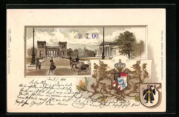 Passepartout-Lithographie München, Königsplatz, Wappen und Münchner Kindl