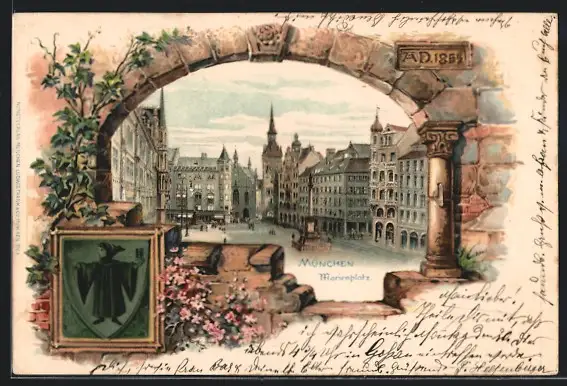 Passepartout-Lithographie München, Marienplatz mit Denkmal, Wappen