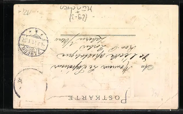 Personenbezogene Daten auf der Rückseite der Karte wurden durch blauen Textmarker unkenntlich gemacht. Die blauen Stellen sind auf die Vorderseite durchgeweicht und wirken sich negativ auf das Postkartenfoto aus