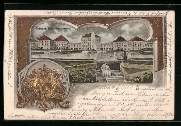 Passepartout-Lithographie München, Schloss Nymphenburg mit Fontäne, Wappen