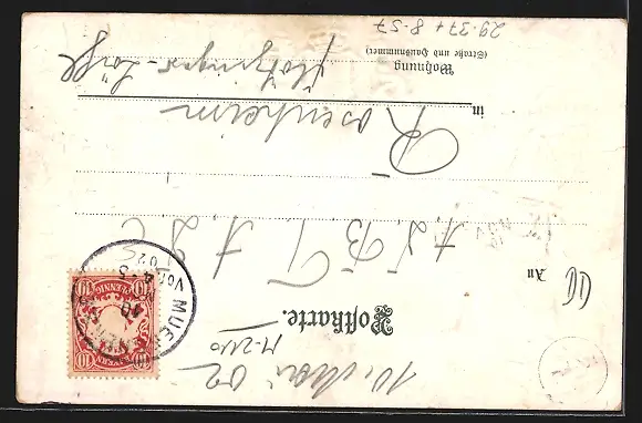 Personenbezogene Daten auf der Rückseite der Karte wurden durch blauen Textmarker unkenntlich gemacht. Die blauen Stellen sind auf die Vorderseite durchgeweicht und wirken sich negativ auf das Postkartenfoto aus