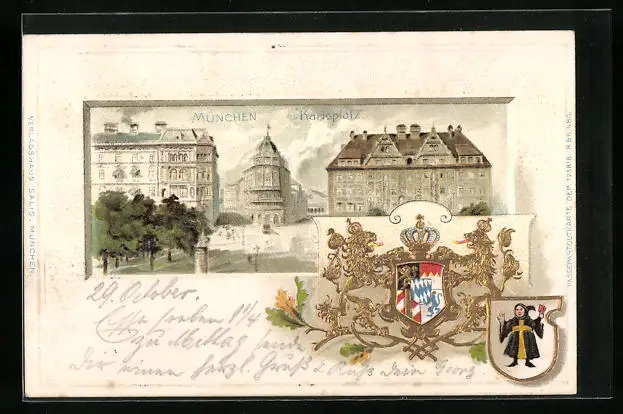 Passepartout-Lithographie München, Strassenpartie am Karlsplatz, Wappen