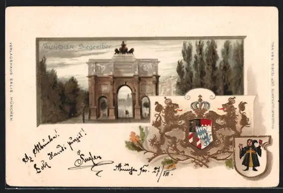 Passepartout-Lithographie München, Strassenpartie am Siegestor, Wappen
