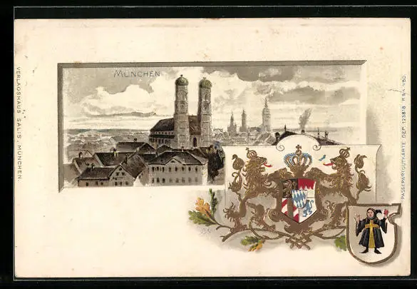 Passepartout-Lithographie München, Teilansicht mit Frauenkirche, Wappen