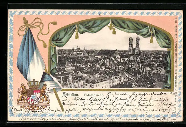 Passepartout-Lithographie München, Totalansicht, Wappen
