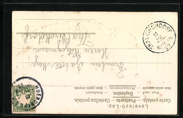 Personenbezogene Daten auf der Rückseite der Karte wurden durch blauen Textmarker unkenntlich gemacht. Die blauen Stellen sind auf die Vorderseite durchgeweicht und wirken sich negativ auf das Postkartenfoto aus