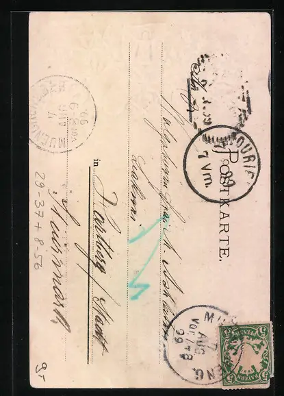 Personenbezogene Daten auf der Rückseite der Karte wurden durch blauen Textmarker unkenntlich gemacht. Die blauen Stellen sind auf die Vorderseite durchgeweicht und wirken sich negativ auf das Postkartenfoto aus