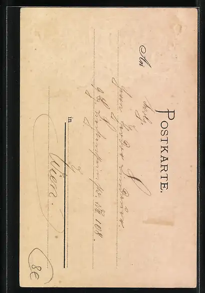 Personenbezogene Daten auf der Rückseite der Karte wurden durch blauen Textmarker unkenntlich gemacht. Die blauen Stellen sind auf die Vorderseite durchgeweicht und wirken sich negativ auf das Postkartenfoto aus