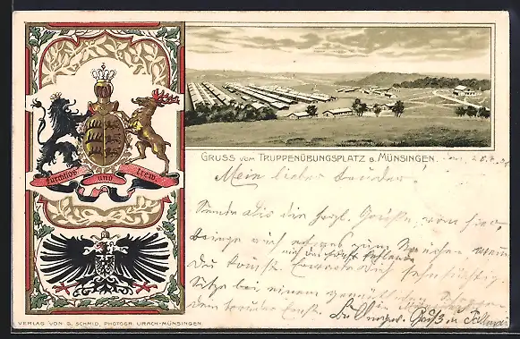 Passepartout-Lithographie Münsingen, Truppenübungsplatz, Teilansicht, Wappen