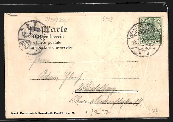 Personenbezogene Daten auf der Rückseite der Karte wurden durch blauen Textmarker unkenntlich gemacht. Die blauen Stellen sind auf die Vorderseite durchgeweicht und wirken sich negativ auf das Postkartenfoto aus
