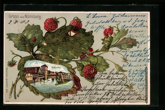 Passepartout-Lithographie Nürnberg, Ansicht vom Henkersteg auf Erdbeerblatt