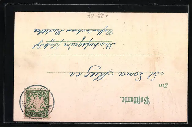 Personenbezogene Daten auf der Rückseite der Karte wurden durch blauen Textmarker unkenntlich gemacht. Die blauen Stellen sind auf die Vorderseite durchgeweicht und wirken sich negativ auf das Postkartenfoto aus