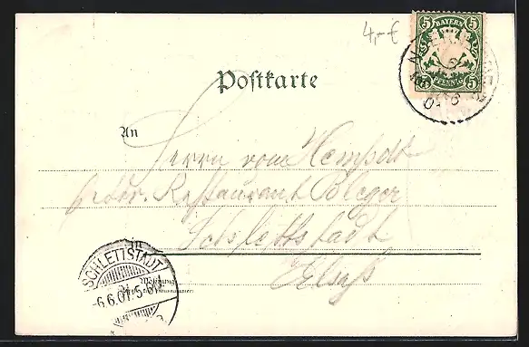 Personenbezogene Daten auf der Rückseite der Karte wurden durch blauen Textmarker unkenntlich gemacht. Die blauen Stellen sind auf die Vorderseite durchgeweicht und wirken sich negativ auf das Postkartenfoto aus