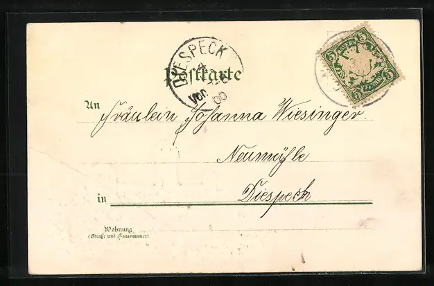 Personenbezogene Daten auf der Rückseite der Karte wurden durch blauen Textmarker unkenntlich gemacht. Die blauen Stellen sind auf die Vorderseite durchgeweicht und wirken sich negativ auf das Postkartenfoto aus
