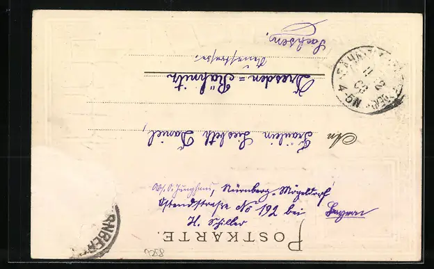 Personenbezogene Daten auf der Rückseite der Karte wurden durch blauen Textmarker unkenntlich gemacht. Die blauen Stellen sind auf die Vorderseite durchgeweicht und wirken sich negativ auf das Postkartenfoto aus