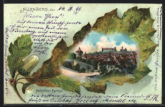 Passepartout-Lithographie Nürnberg, Hallerthor-Partie im Eichenblatt