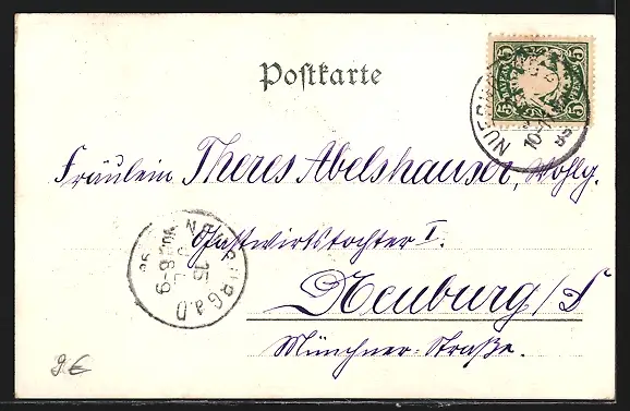 Personenbezogene Daten auf der Rückseite der Karte wurden durch blauen Textmarker unkenntlich gemacht. Die blauen Stellen sind auf die Vorderseite durchgeweicht und wirken sich negativ auf das Postkartenfoto aus