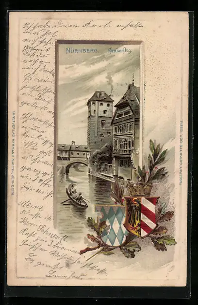 Passepartout-Lithographie Nürnberg, Henkersteg mit Boot, Wappen
